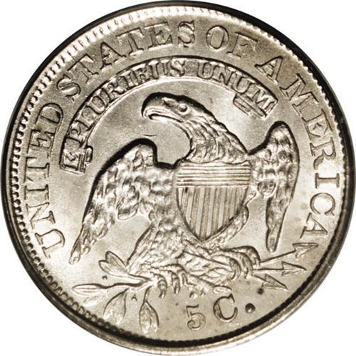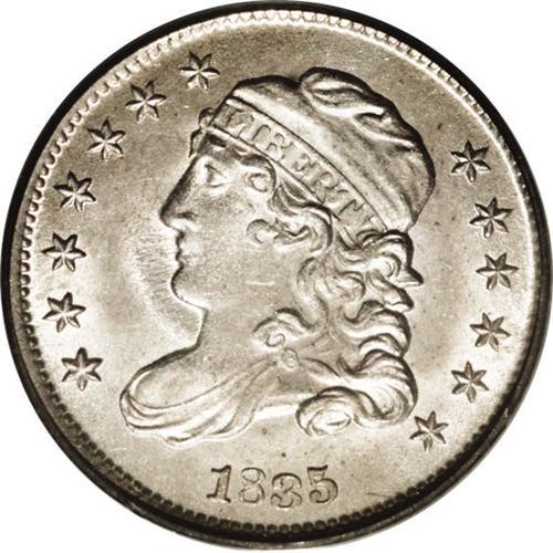 <B>1835<H10C> Small Date, Small 5C MS65 PCGS.</B></I> V-7, LM-10, R.1. A pinpoint-sharp and undisturbed near-Gem with light cream-gray toning. This beautiful piece features hair-thin die cracks across the first T in STATES and from the M in UNUM to the eagle's left (facing) shoulder. The upper loop of the second S in STATES is filled. Population: 6 in 65, 6 finer (4/06).