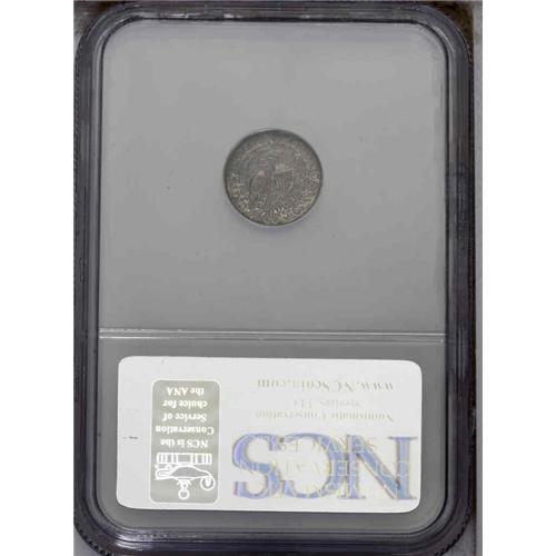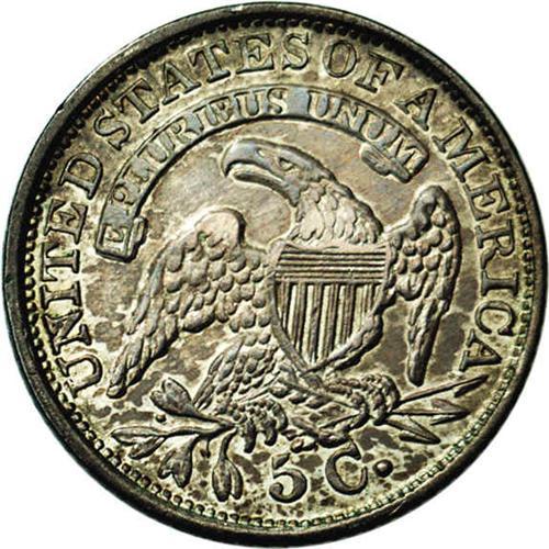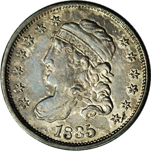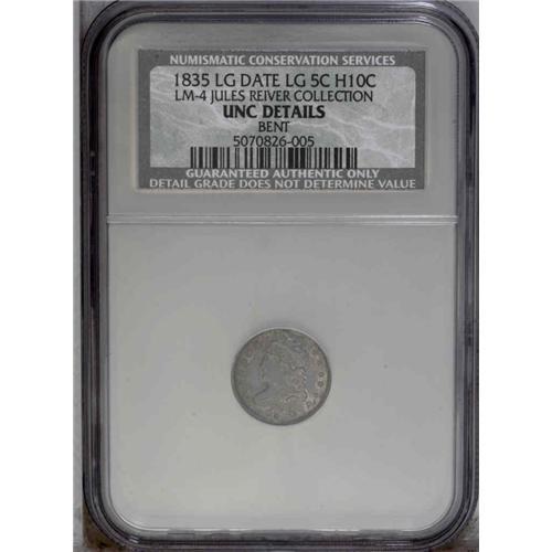 <B>1835<H10C> Large Date, Large 5C. V-11, LM-4, R.3. Reiver state a.--Bent--NCS. Unc. Details.</B></I> Toned on the obverse with gunmetal blue and gray, and the reverse has speckled gold in the fields. No nicks or marks seem to account for the bend in the planchet, but in the holder this is difficult to ascertain. Fairly well struck, and an early die state of this pairing.<BR> Curiously, this die marriage was first described by W. W. Neil in 1927 <I>Numismatist</B></I> August issue, but Valentine did not include it his variety book a few years later. Breen later rediscovered this variety and published it in <I>The Coin Collector's Journal</B></I> #160.<BR><I>No pedigree information included.</B></I> Envelope Included.