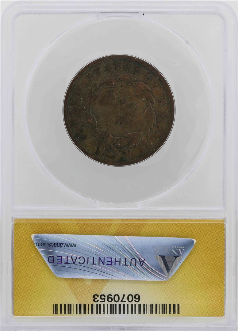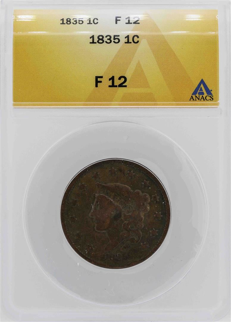 One 1835 Large Cent Coronet Head 1C Coin ANACS F12. ANACS Certified.