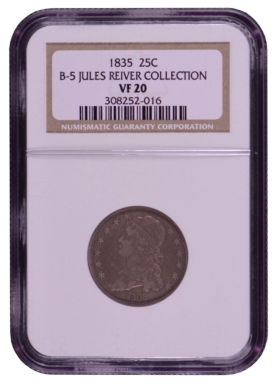 One 1835 Liberty Capped Bust Quarter Coin NGC VF20.