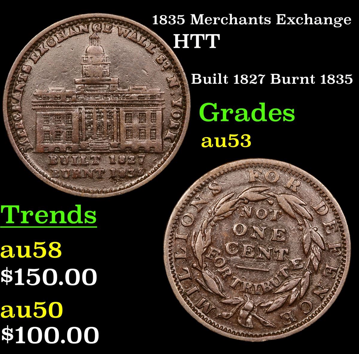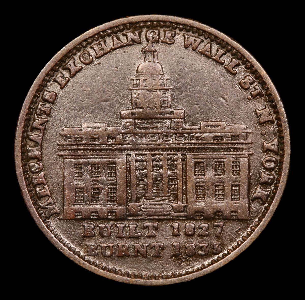 1835 Merchants Exchange Built 1827 Burnt 1835 . Hard Times Token 1c Grades Select AU.