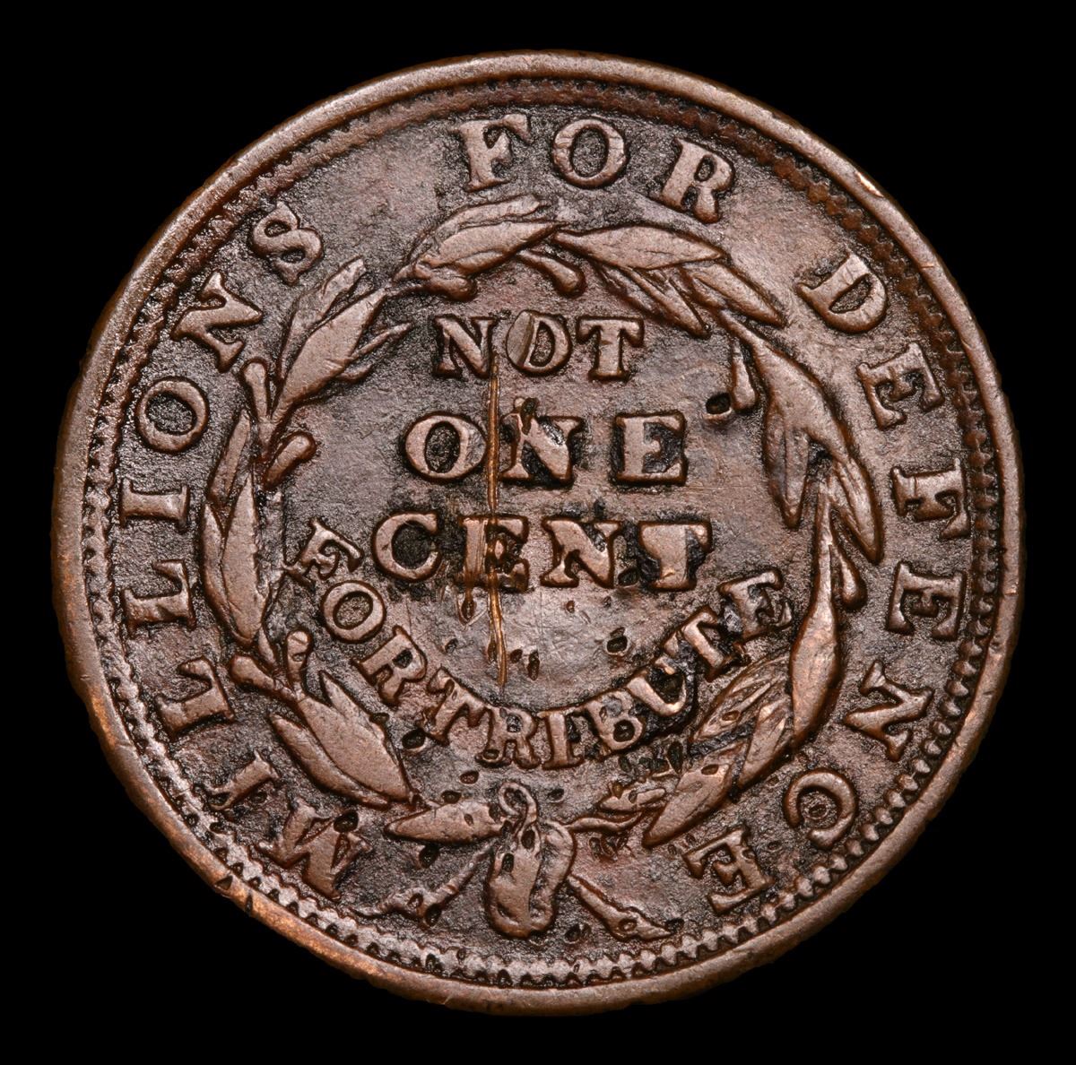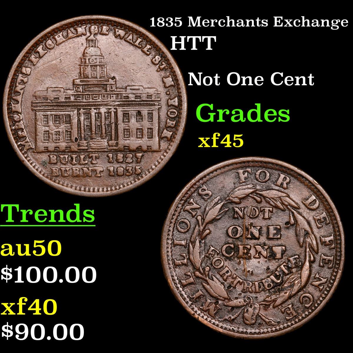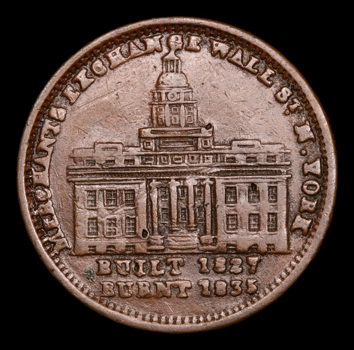1835 Merchants Exchange Not One Cent . Hard Times Token 1c Grades xf+. Hard Times tokens are privately issued mostly copper large cent sized tokens that were produced from 1833 to 1844. Hard Times Token "Millions for Defence / Not One Cent for Tribute" Merchants Exchange of Wall Street New York "Built 1827, Burnt 1835". The original Merchant's Exchange was located at Wall and William Streets in Manhattan, New York from 1827 until it burned in the fire of 1835. Isaiah Roger's Merchant's Exchange was built on the same site in 1842. The period of economic hardship during Van Buren's presidency (the Panic of 1837) came to be known as the "Hard Times". With America in a deep recession, people began hoarding coins as a safeguard, and small change disappeared from the marketplace. In response, merchants began buying tokens from private mints so they could make change in business transactions. They were made of copper with a reverse similar to legal U.S. cents. It is a rare piece of American history, and a true prize for collectors.