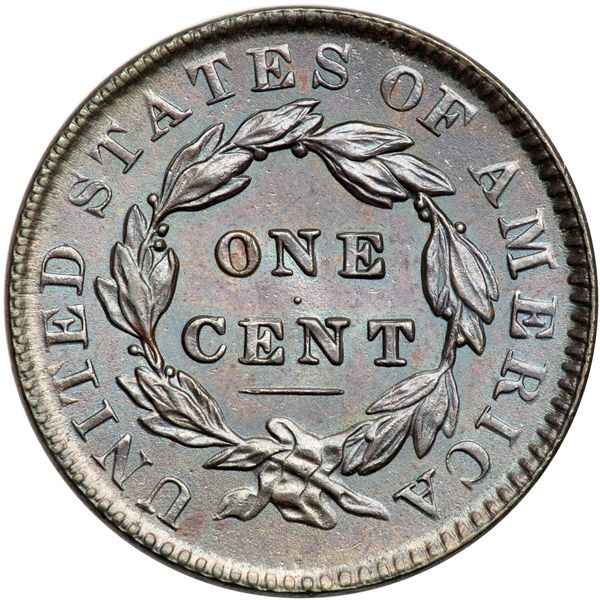 1835 N-1 R1 Head of 1834 with Large 8 & Stars MS60+. Lustrous bluish steel and light olive with a half dozen tiny splashes of lighter reddish brown toning on the reverse, including one inside the O in ONE. A tiny vertical nick or planchet chip on the truncation over the 8 is a good identifying mark. M-LDS. A fine radial die crack has formed connecting the midpoint of the earlier crack from star 11 to star 12 to the dentils. Removed from an NGC slab graded MS64BN (NGC label included, and it shows the attribution).