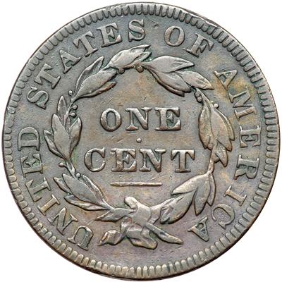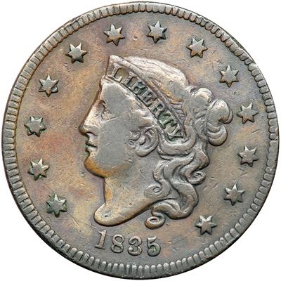 1835 N-10 R4+ F12. Fine-12. Head of 1834. Glossy light olive brown and chocolate. Close to F15 except for a rim bruise above star 9 and a tiny one above star 6. Nicely struck and the eye appeal is excellent for the grade in spite of the minor marks. EDS.