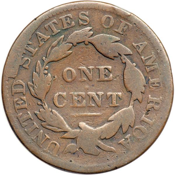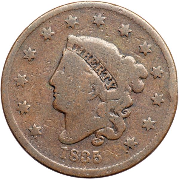 1835 N-10 R4+ G5+. Good-5+. Glossy medium brown and rather nice for the grade, close to G6. A rim dent at star 11 and a smaller one at OF are the only defects. The date and legends are clear. Rare LDS with a cud break at D-STAT. About a half dozen are known with the cud break, and the best of these is only VG. The reverse is rotated 15 degrees CW. Called VG7 net G6 and tied for CC#2 of those known with the cud break in the Noyes census, his photo #37411. DWH #1891.