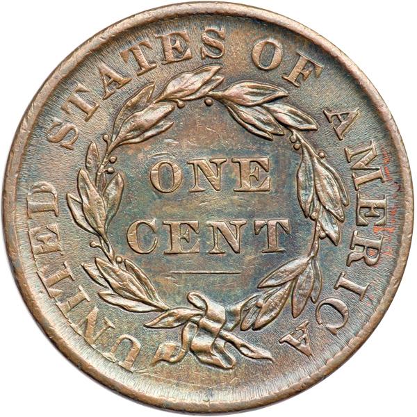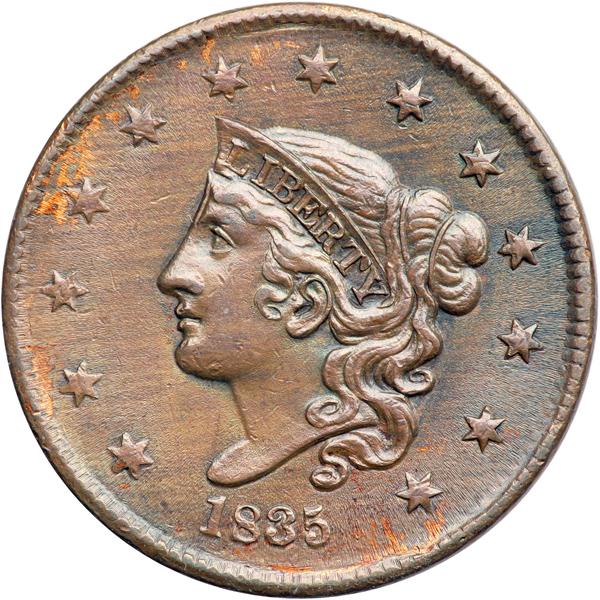 1835 N-15 R2 EF45. Head of 1836. Partial Double Profile. EF-45. Five points sharper but very lightly cleaned, now nicely retoned a frosty light bluish steel brown and tan with traces of faded red in a few protected areas. LDS with the dentils nearly gone and flowlines covering the fields. The small chip under the right edge of the 3 that is present in the early state is now gone. There is a clear double profile on the forehead, lips, chin, stars 8-12, and on ERTY, all caused by die bounce. DWH #1058.
