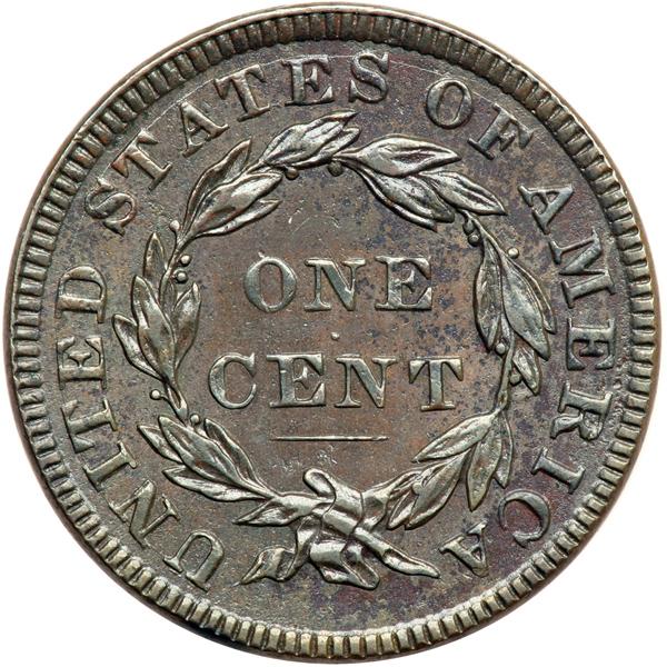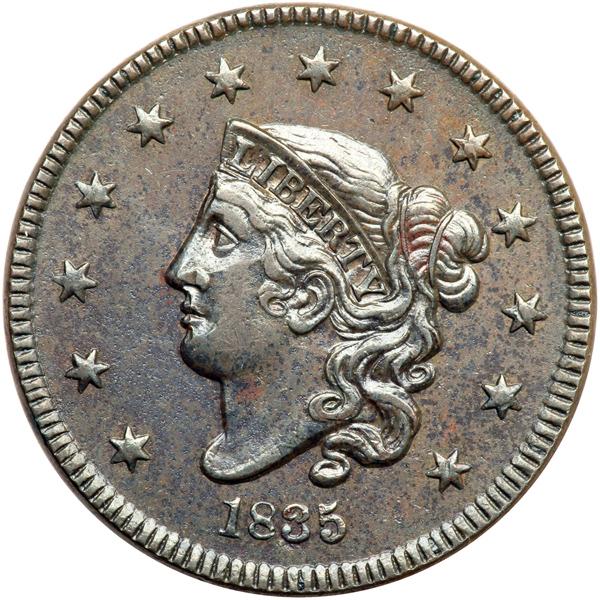 1835 N-2 R3 EF40. Double and Triple Profiles. EF-40. Slightly sharper with some extremely tiny pitmarks sprinkled about the fields, these marks so fine the surfaces remain attractive and glossy with a hint of prooflike reflectivity. A small nick in the center of star 13 is the best identifying mark. Glossy chocolate and steel brown finely mottled with darker olive and reddish chocolate tones. MDS with the obverse fields slightly reflective from a fresh die lapping that removed flowlines from both sides. The dentils are crisp. There is clear repunching on the UN, including some inside the bottom of the U, but it is a bit weaker thanks to the die lapping. The minor die rust under the U is gone and the reverse is rotated 15 degrees CCW. A double profile shows on the forehead and nostril with triple outlines on the lips, chin, and stars 8-12. Called EF40 in the Noyes and Bland census lists. Tied for CC#7 among the confirmed examples in the Bland census but tied for CC#10 in the Noyes list. Comes with a nice provenance. DWH #1909.
