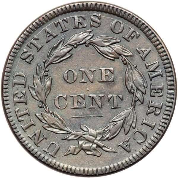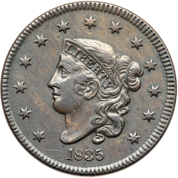 1835 N-2 R3 EF40. Frosty light olive brown delicately woodgrained with slightly lighter chocolate brown tones. Virtually flawless; a short horizontal scratch under star 1 is the only defect. Great eye appeal. E-MDS. The repunching on the U in UNITED is clear.