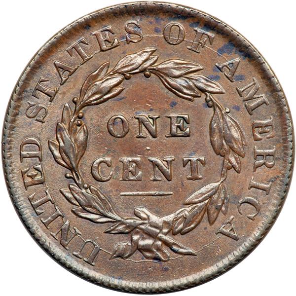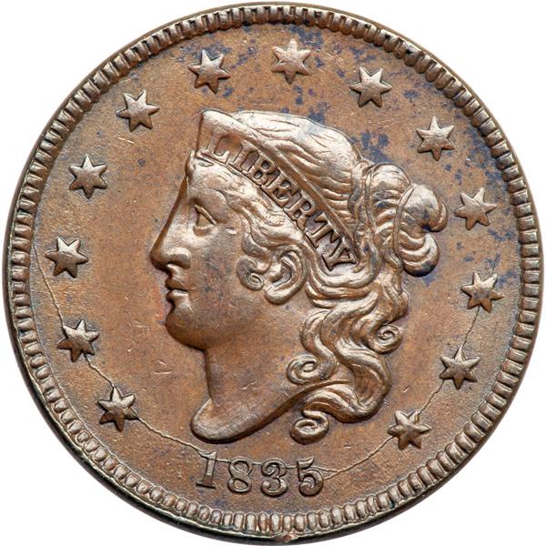 1835 N-3 R3 EF45. EF-45. Glossy medium brown and chocolate with underlying frosty mint luster covering the fields and protected areas. There are specks of dark olive toning peppered about the field at stars 6-11 with some more on the reverse, mostly at ES-OF-AM. The only contact marks are a small rim nick under the 3 in the date and a tiny tick just right of the eye. E-MDS, before the tiny rim cuds occur in the dentils roots below the 35 or at the bottom of star 2. The reverse is rotated 20 degrees CW. Called EF45 and tied for CC#3 in the Bland census. Noyes says AU50 net VF35 and CC#4, his photo #26078. This variety is unknown in mint state. Removed from an NGC slab graded MS63BN (NGC label included). DWH #2619.