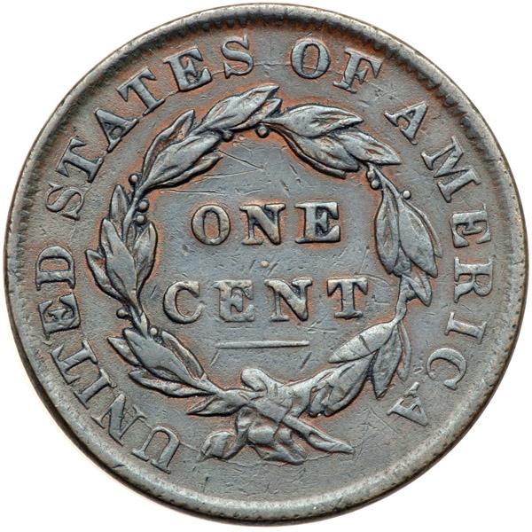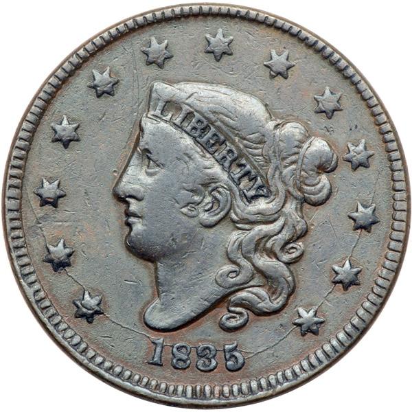 1835 N-3 R3 F15. Five points sharper but recolored slightly glossy dark olive and steel with lighter reddish brown toning in protected areas. No roughness or verdigris, just a few light contact marks. Some tiny scratches above the O in ONE are the best identifying marks. EDS, prior to crumbling in the dentils under the 35.