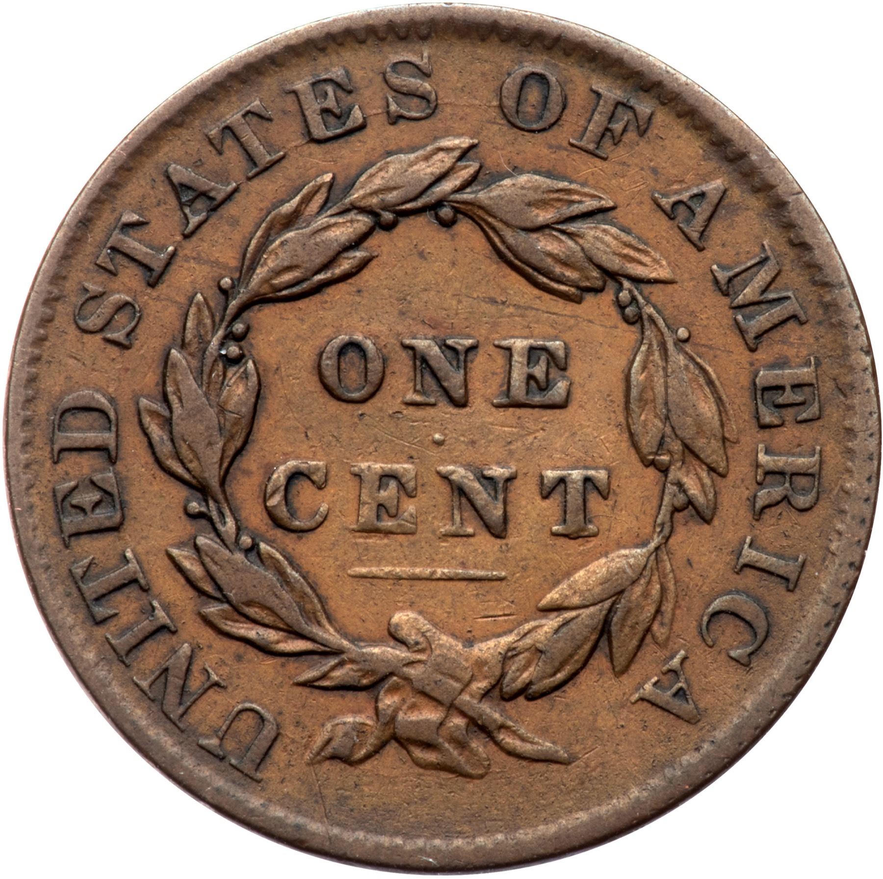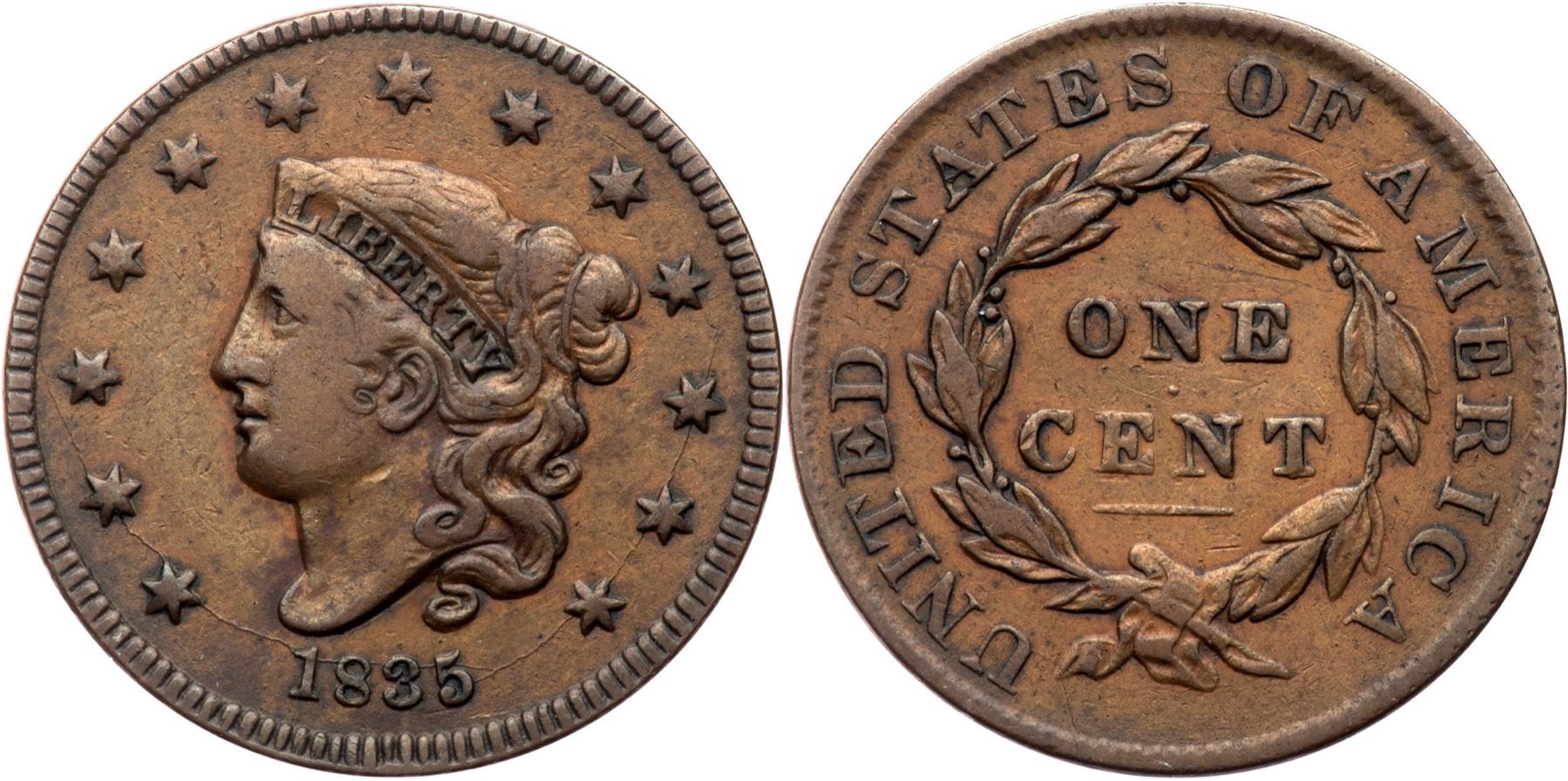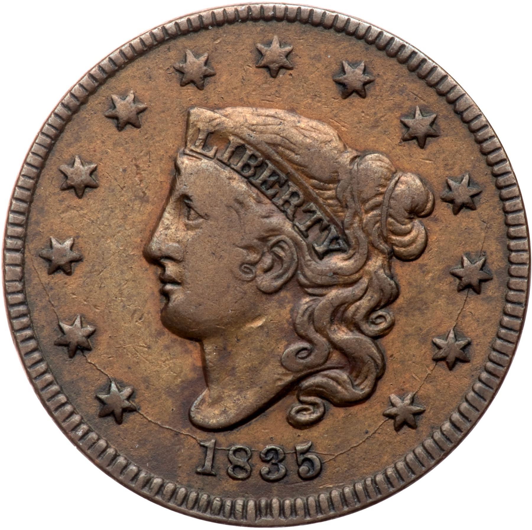 Medium tan and brown possibly retoned, nicely if so. A couple tiny tics in the obverse field. A short scratch from the ribbon end to the rim.