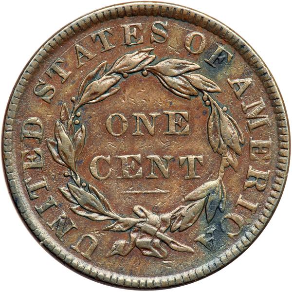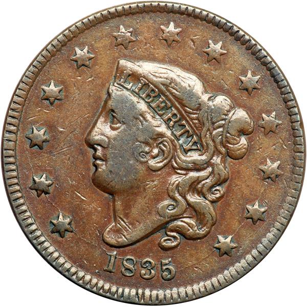 1835 N-4 R4+ VF20. VF-20. Slightly sharper with a few too many light contact marks, the notable ones being three thin, parallel nicks on the bust tip. Glossy medium brown and chocolate with small splashes of darker olive brown toning at F in OF and CA in AMERICA. EDS, before the radial die cracks up to the dentils from the tops of the N and D in UNITED. Called VF25 net F15 and tied for CC#10 in the Noyes census, his photo #36472. DWH #2471.