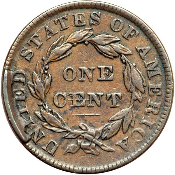 1835 N-4 R4+ VF20. VF-20. Sharpness close to VF25 but there is a planchet flake in the field at the inner curl and a tiny pinscratch across the E in CENT. The planchet flake is a mint-made flaw, but it catches the eye. Otherwise this cent is smooth and very nice for the grade. Glossy medium brown. Rare terminal die state with a large cud break at NITED. Called VF25 in the Bland census. Noyes says VF25 net F15 and tied for CC#10, his photo #31794. Near the lower end of the condition census for the variety, but significantly higher among those few known with the rim cud. DWH #3316.
