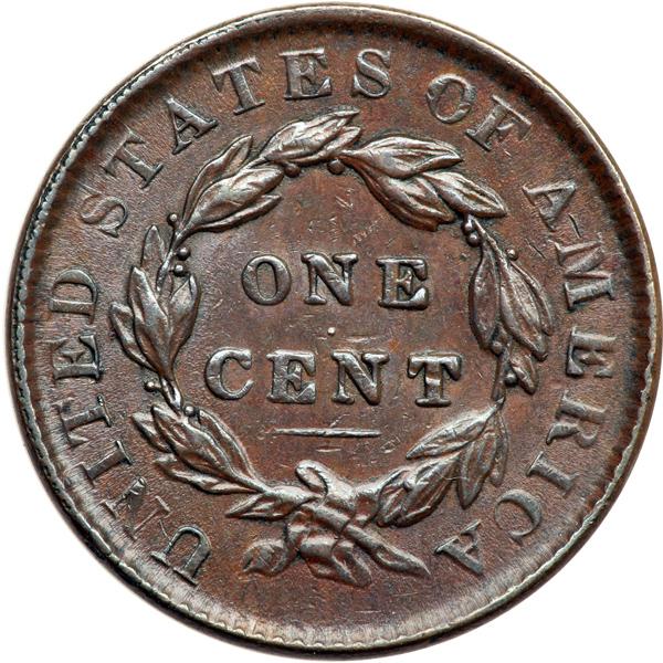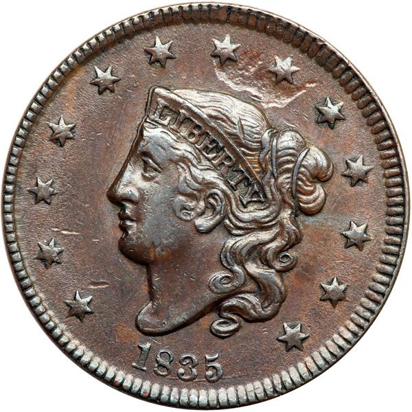 1835 N-5 R2 EF40. Double Profile. EF-40. Slightly sharper with a nick in the hair over ER, a nick on the throat, and a shallow low spot (caused by debris on the die) connecting stars 7 & 8. Glossy medium brown and chocolate with flowline frost covering the protected areas. LDS. The obverse die flowlines are stronger and a narrow but clear double profile extends from the tip of the coronet down to the chin, with additional doubling on ERTY and stars 9-11. DWH #1034.