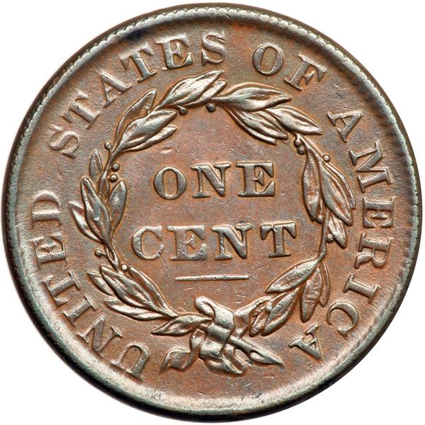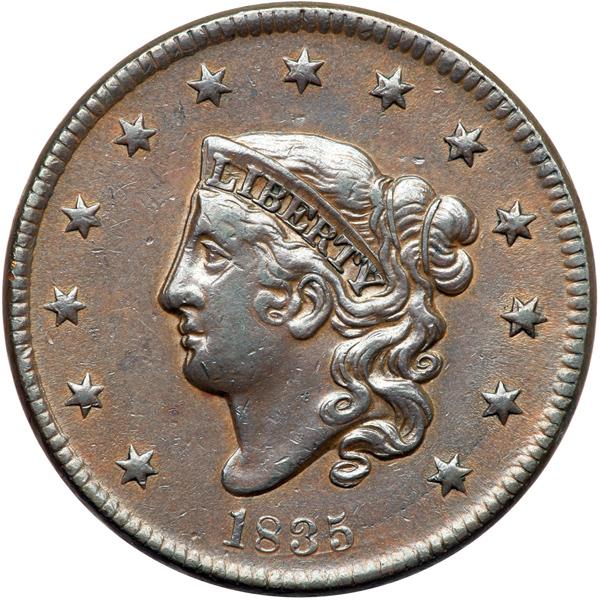 1835 N-6 R1 EF40. Double Profile. Rotated Reverse. EF-40. Glossy steel brown with frosty light brown toning covering the protected areas. Smooth with only a few minor marks, including a thin nick on the chin, a couple tiny nicks between stars 5 & 6, and a small spot of darker steel toning at the dentils over the second T in STATES. M-LDS. The repunching on the right bottom of the C in AMERICA is gone but the rim cud breaks over AMER have not formed. A clear double profile reaches from the tip of the coronet down to the chin and the reverse is rotated 45 degrees CW. Removed from an NGC slab graded AU58BN (NGC label included, and it shows the attribution and Reiver provenance). DWH #2936.