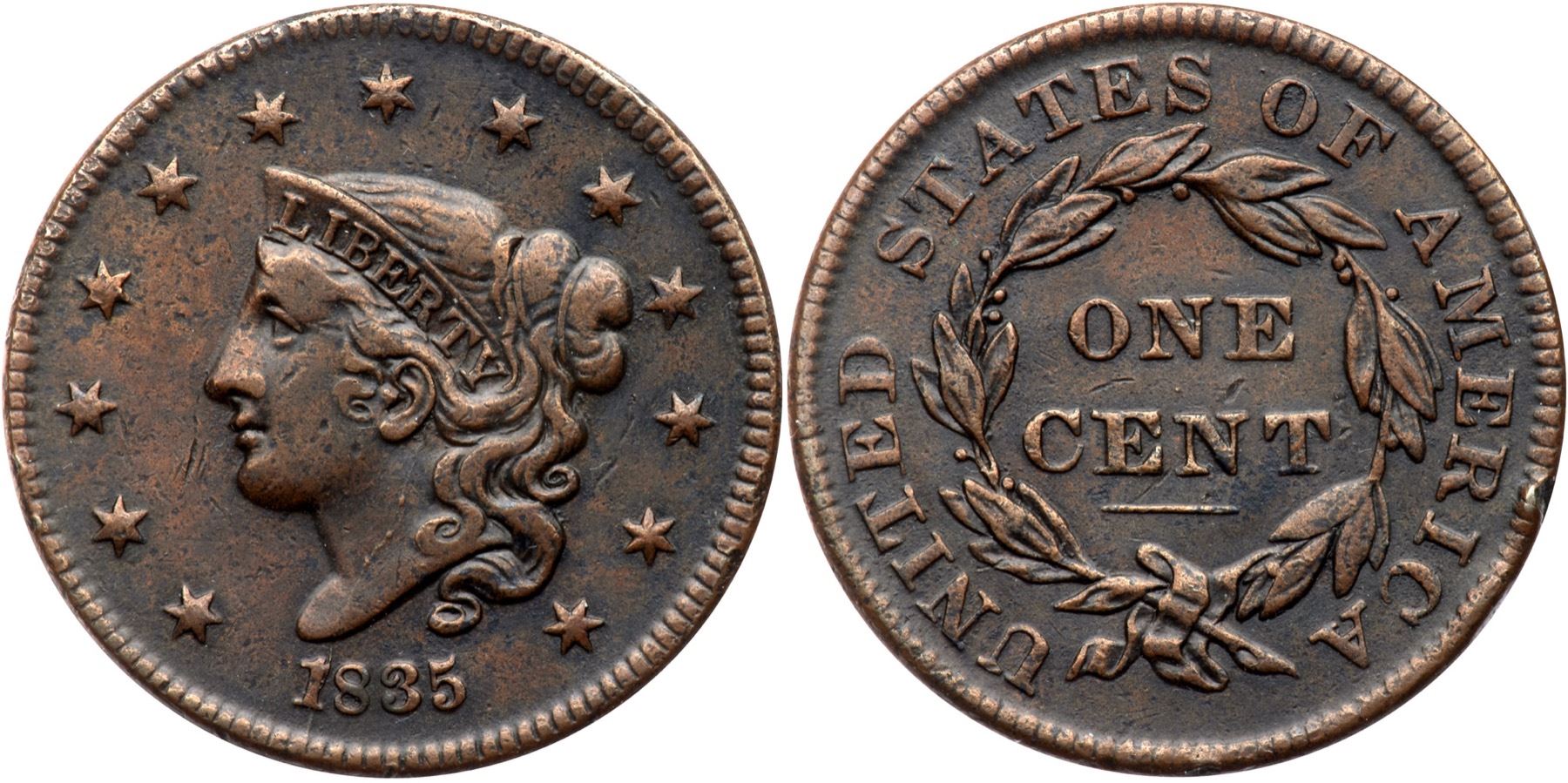 Dark chocolate with some darker patina. Tiny rim tick reverse K4. Late die state with crack from rim below 1 to Liberty’s ear.