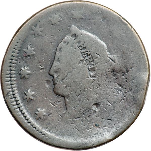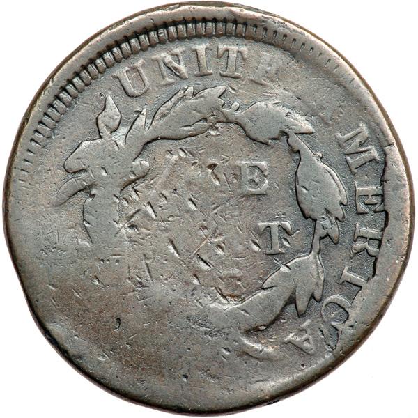 1835 N-9 R4+ G4. Large 8. Multiple Strikes with Large Cud ERIC. Good-4. Glossy steel brown with darker steel brown toning in protected areas. Sharper than G4 in many areas, but the impression is uneven thanks to the double strike. In addition, there are small nicks scattered about both sides, including a dull one in the field close off the chin and another on the shoulder. A pair of dull rim bruises on the right side of the obverse round out the notable defects. LDS with a bold cud break involving the tops of ERIC and extending to the rim above the adjacent M and A. One of only two or three known with the single cud break (see next piece), and all are double struck, as is this example. There are two clear strikes visible on each side, but they do not line up is you assume a normal head-to-foot die orientation (which is a risky assumption to be sure). The two obverse impressions are rotated about 20 degrees relative to each other while the reverse strikes show a rotation of about 125 degrees between those impressions. The differences are difficult to "noodle out," but it is possible there were two planchets struck at the same time causing only one side to come into contact with a die during at least one of the strikes. Add to the equation the fact that the only other example I’ve examined with the reverse cud (but without the obverse cud) also clearly shows more than one strike on each side. Regardless, this cent is an impressive mint error and an extremely rare die state. (This was the only cent in the Reiver collection sale not housed in an NGC or NCS slab for the auction.) DWH #2939.