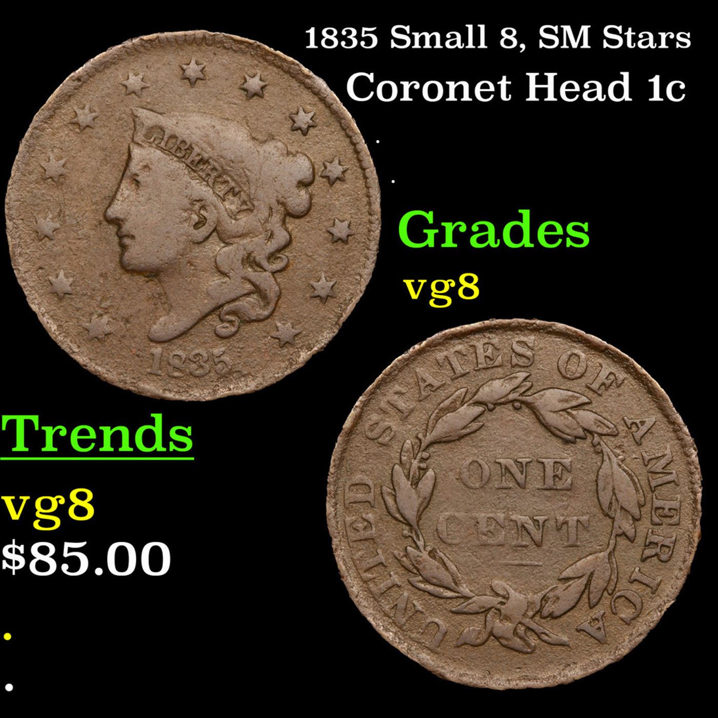 1835 Small 8, SM Stars Coronet Head Large Cent 1c Grades vg, very good.