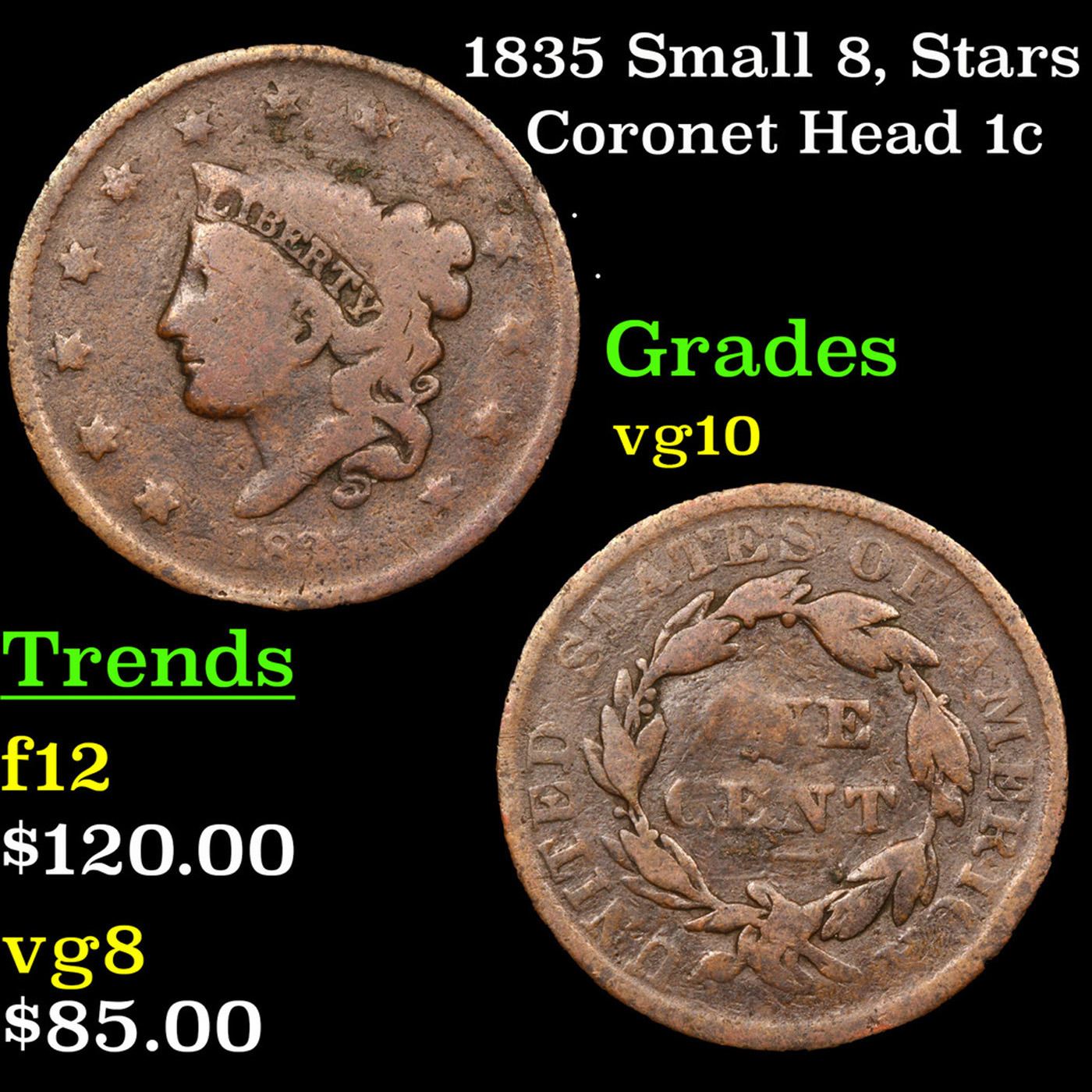 1835 Small 8, Stars Coronet Head Large Cent 1c Grades vg+