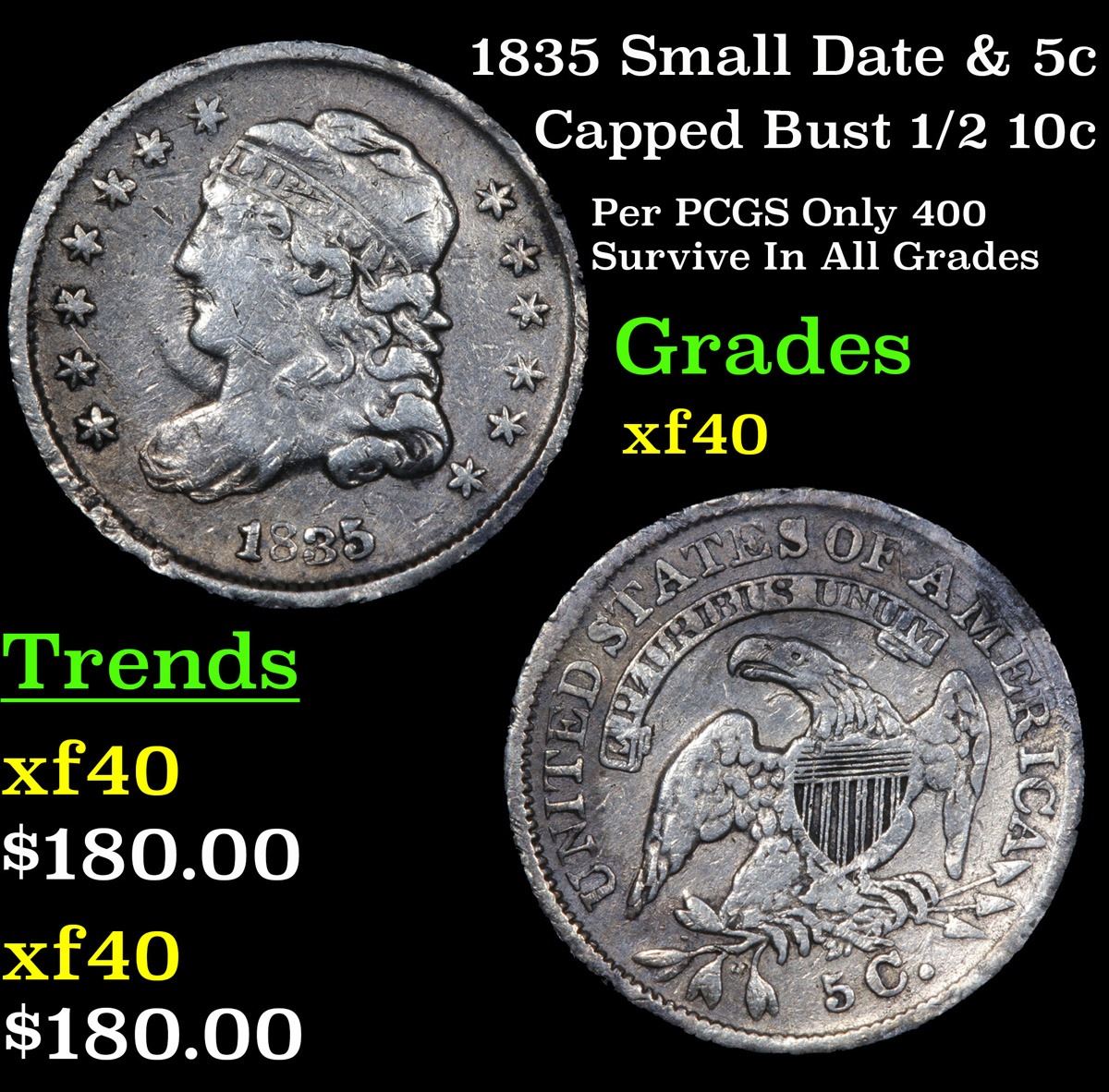1835 Small Date & 5c Capped Bust Half Dime 1/2 10c Grades xf.