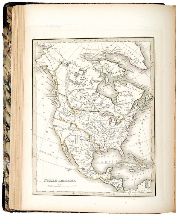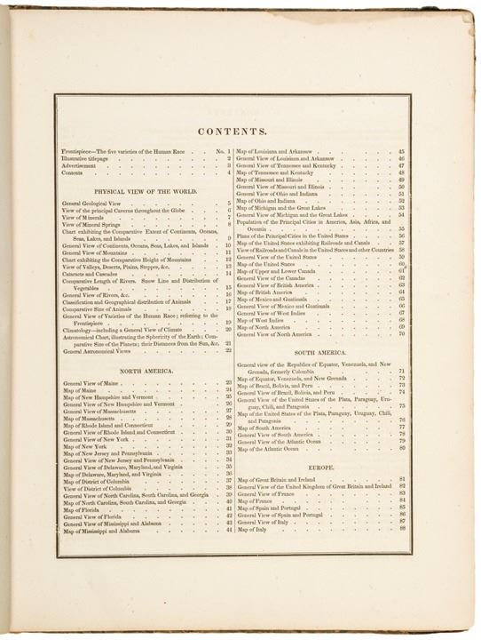 This is the First Edition of what is considered to be, “one of the first American general atlases to supplement the maps with lengthy geographical descriptions” (Ristow, 271), with Hand-colored frontispiece, entitled “The Five Varieties of the Human Race,” and 66 detailed Color-outlined Maps, 19 of which being Maps of the United States, and has 10 Engraved Diagrams.