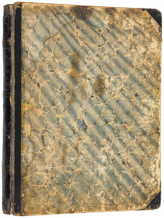 This Altlas has it’s original Marbled Boards rebacked in three-quarter green close-grain Morocco with decorative raised bands, Folio, measuring 11” x 13.5” complete with its original brown spine label laid down and gold print, worn but with a 1” end piece lacking at the top of the spine. There are some trivial scattered marginal edge chips and expected offset and foxing.