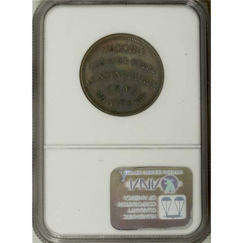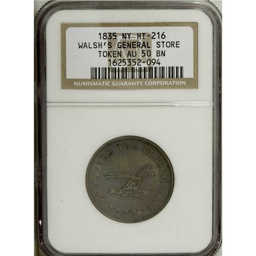<B>1835 Walsh's General Store, Low-99, HT-216, R.1, Lansingburgh, NY, AU50 NGC.</B></I> Medium chocolate-brown color covers the surfaces of this problem-free token. A similar example (lot 5887) brought approximately $200 in our September 2006 auction in Long Beach.<BR><BR><b>Shipping:</b> Coin/Currency (<a target="_blank" href="http://www.heritageauctions.com/common/shipping.php">view shipping information</a>)