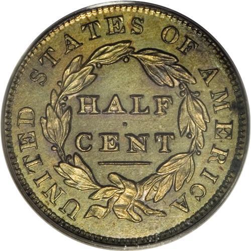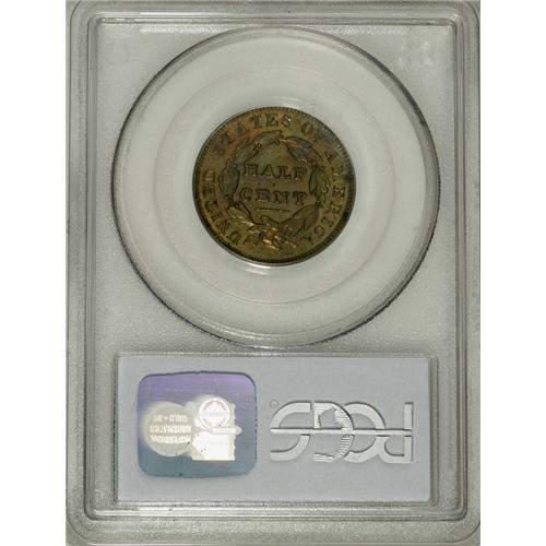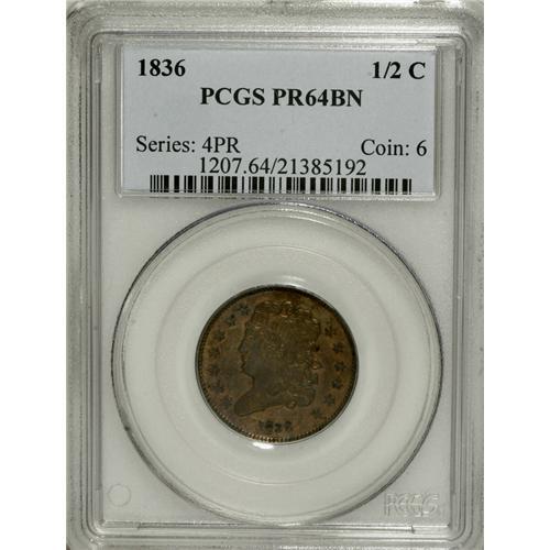 <B>1836 1/2 C PR64 Brown PCGS.</B></I> B-1 Original, Large Berries, Low R.6. Only proof half cents were struck in 1836, and restrikes of this issue were produced in later years. The same pair of dies were used for both Original and First Restrike half cents of this date, and the differences are minute. In his <I>Half Cent Encyclopedia,</B></I> Walter Breen stated: "These are often confused with the First Restrikes below in his reference ; the quickest way to tell them apart is that on the Originals, the borders are in every way similar to those on proofs of 1832-35, whereas on the Restrikes the obverse die shows buckling and the borders are much more pronounced, 'squared,' with knife rims."<BR> Due to the PCGS holder, it is not possible to determine if the borders are squared or not, and it is also difficult to detect any obverse die buckling. This piece has every appearance of being an unbuckled Original. The surfaces of this Choice proof are sufficiently mirrored with bright olive and golden-brown color. Each side has a few dark spots, with those by the date serving as convenient pedigree markers. EAC PR60.<BR><BR><b>Shipping:</b> Coins & Currency (<a target="_blank" href="http://www.heritageauctions.com/common/shipping.php">view shipping information</a>)