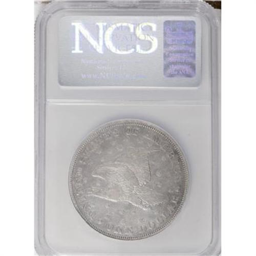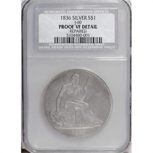 <B>1836 $1 Judd-60 Original--Repaired--NCS. PR VF Detail.</B></I> Silver. Plain Edge. Die Alignment IV (medallic alignment with the head of Liberty opposite OF). This is from the third striking period: March 1837. The first and second periods are from early and late December 1836. While we have conveniently labeled this as a Die Alignment IV piece, the eagle is not technically flying level when given a medallic turn. This is because these March 1837 pieces started out in Die Alignment II (eagle flying upward) and the reverse die was apparently loose, making successive strikes lower and lower. This piece is technically an intermediate die alignment coin, but very close to Die Alignment IV. <BR> The surfaces are light gray overall with a number of small marks and shallow scratches, as one would expect from a VF coin. The repair mentioned on the NCS insert is in the upper right obverse field.<BR><BR><b>Shipping:</b> Coins & Currency (<a target="_blank" href="http://www.heritageauctions.com/common/shipping.php">view shipping information</a>)
