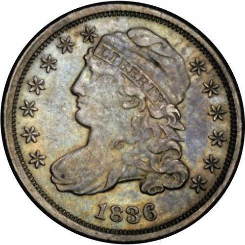<B>1836<10C> JR-2, R.2. Reiver state a.--Improperly Cleaned--NCS. XF Details.</B></I> Dark gray with bluish hints in the fields from being retoned. The obverse die cracked early from the top of Liberty's cap down through the T and clasp to the rim through the 3 in the date. Softly struck at the centers. There is a small cluster of nicks on the shield.<BR><I>Ex: First State Coins (October 1982).</B></I> Envelope Included.
