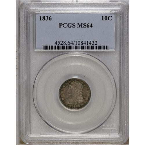 <B>1836 10C MS64 PCGS.</B></I> JR-3, R.3. Golden-brown and lavender patina covers the subtly lustrous surfaces. Nicely detailed and highly appealing with no significant distractions. Population: 12 in 64, 13 finer (10/06).<BR><BR><b>Shipping:</b> Coin/Currency (<a target="_blank" href="http://www.heritageauctions.com/common/shipping.php">view shipping information</a>)