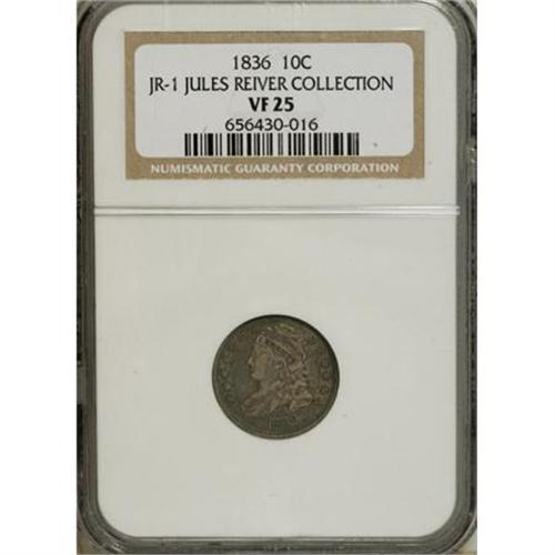 <B>1836 10C VF25 NGC.</B></I> JR-1. Ex: Jules Reiver Collection.. NGC Census: (2/164). PCGS Population (5/153). Mintage: 1,190,000. Numismedia Wsl. Price for NGC/PCGS coin in VF25: $81. (#4528)<BR><BR><B>Coin Engraver:</B> John Reich<BR><BR><b>Shipping:</b> Coins & Currency (<a target="_blank" href="http://www.heritageauctions.com/common/shipping.php">view shipping information</a>)