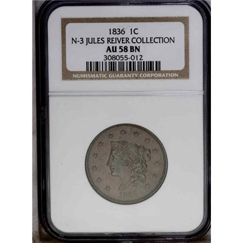 1836 1C AU58 NGC. N-3, R.1. Early Die State. This is t 1836[1C] N-3, R.1. AU58 NGC. AU50 EAC.