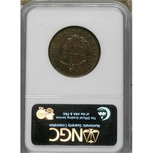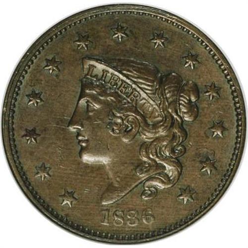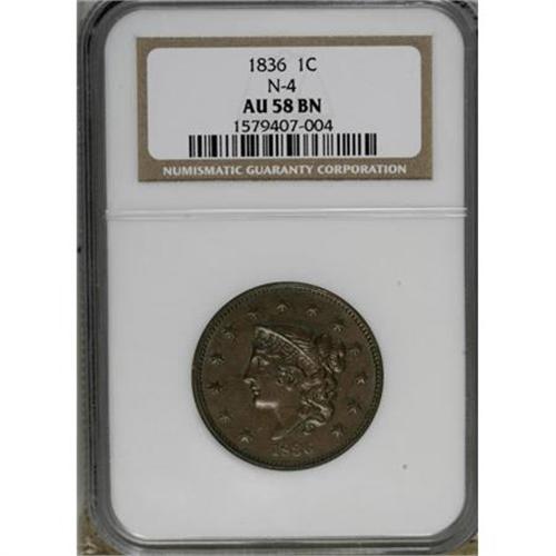 <B>1836 1C AU58 NGC.</B></I> N-4. NGC Census: (20/86). PCGS Population (15/45). Mintage: 2,111,000. Numismedia Wsl. Price for NGC/PCGS coin in AU58: $192. (#1726)<BR><BR><B>Coin Engraver:</B> Robert Scot or John Reich<BR><BR><b>Shipping:</b> Coins & Currency (<a target="_blank" href="http://www.heritageauctions.com/common/shipping.php">view shipping information</a>)