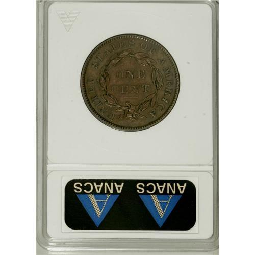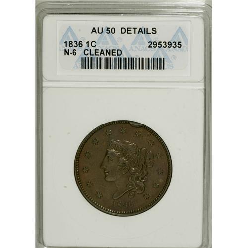 <B>1836 1C --Cleaned--ANACS. AU50 Details.</B></I> N-6. NGC Census: (1/112). PCGS Population (5/76). Mintage: 2,111,000. Numismedia Wsl. Price for NGC/PCGS coin in AU50: $158. (#1726)<BR><BR><b>Shipping:</b> Coins & Currency (<a target="_blank" href="http://www.heritageauctions.com/common/shipping.php">view shipping information</a>)