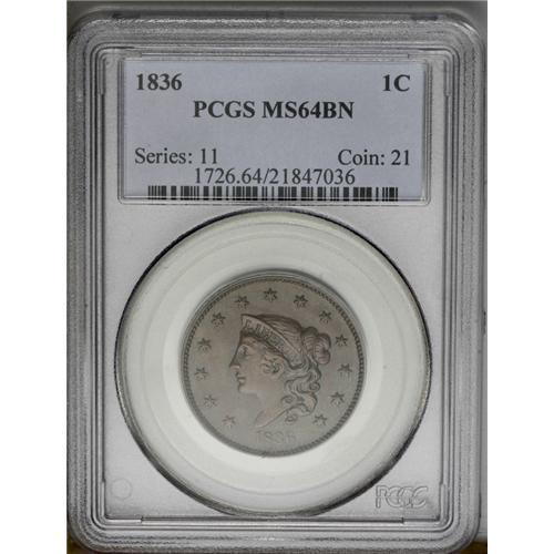1836 1C MS64 Brown PCGS. N-4, R.3. The Es in the rever 1836