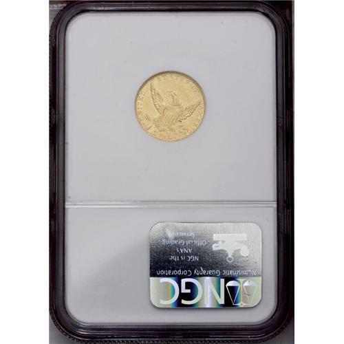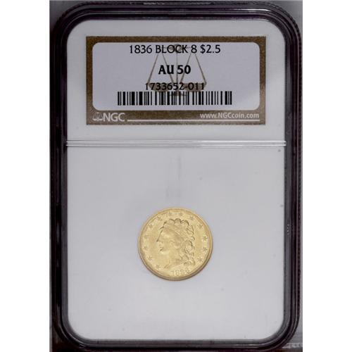 <B>1836<$2 1/2> Block 8 AU50 NGC.</B></I> McCloskey-C, Head of 1837, Breen-6144, R.2. The flat, shorter first hair curl above Liberty's headband confirms the variety. Yellow-gold surfaces display traces of luster in the protected areas, and occasional softness is seen on the design elements, especially Liberty's hair curls. The few minute marks scattered about are not out of line with the grade. Overall, a nice early quarter eagle.