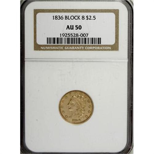 <B>1836 $2 1/2 Block 8 AU50 NGC.</B></I> Head of 1837, Breen-6144, McCloskey-C, R.2. Block 8. An attractive AU example with soft definition on the eagle's left (facing) leg. Typically worn for the grade.<BR><BR><B>Coin Engraver:</B> William Kneass<BR><BR><b>Shipping:</b> Coins & Currency (<a target="_blank" href="http://www.heritageauctions.com/common/shipping.php">view shipping information</a>)