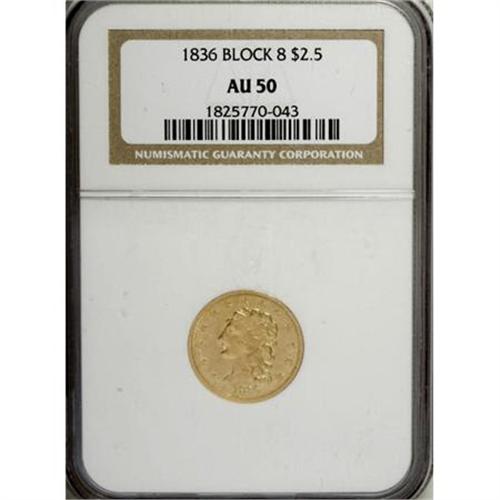 <B>1836 $2 1/2 Block 8 AU50 NGC.</B></I> Head of 1837, Breen-6144, McCloskey-C, R.2. Block 8. A generous amount of design detail remains evident on the surfaces of this AU survivor. Several small abrasions are noted, along with faint hairlines in the fields.<BR><BR><B>Coin Engraver:</B> William Kneass<BR><BR><b>Shipping:</b> Coins & Currency (<a target="_blank" href="http://www.heritageauctions.com/common/shipping.php">view shipping information</a>)