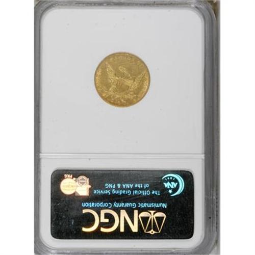 <B>1836 $2 1/2 Block 8 AU53 NGC.</B></I> Head of 1837, Breen-6144, McCloskey-C, R.2. The front curl on Liberty's head is smaller than the one immediately behind it, and on the reverse, the olive branch shows a berry to the left. This well struck and still-lustrous yellow-orange example shows minor but distinct wear that is concentrated on the highpoints.<BR><BR><B>Coin Engraver:</B> William Kneass<BR><BR><b>Shipping:</b> Coins & Currency (<a target="_blank" href="http://www.heritageauctions.com/common/shipping.php">view shipping information</a>)