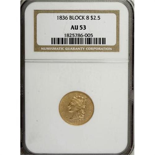 <B>1836 $2 1/2 Block 8 AU53 NGC.</B></I> Head of 1837, Breen-6144, McCloskey-C, R.2. Boldly defined with modest rub on the highpoints and a pinscratch across Liberty's cheek. An appealing reddish-gold specimen. <BR><BR><B>Coin Engraver:</B> William Kneass<BR><BR><b>Shipping:</b> Coins & Currency (<a target="_blank" href="http://www.heritageauctions.com/common/shipping.php">view shipping information</a>)