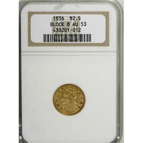 <B>1836 $2 1/2 Block 8 AU53 NGC.</B></I> Head of 1837, Breen-6144, McCloskey-C, R.2. An attractively detailed green-gold Classic quarter eagle that has plenty of glowing luster in design recesses. Faint marks on the upper reverse are distant from the focal points.<BR><BR><B>Coin Engraver:</B> William Kneass<BR><BR><b>Shipping:</b> Coins & Currency (<a target="_blank" href="http://www.heritageauctions.com/common/shipping.php">view shipping information</a>)