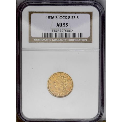 1836 $2 1/2 Block 8 AU55 NGC. McCloskey-C, Head of 183 1836[$2 1/2] Block 8 AU55 NGC.