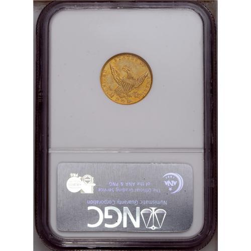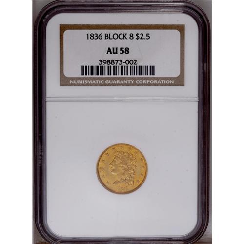 <B>1836 $2 1/2 Block 8 AU58 NGC.</B></I> McCloskey-B, Head of 1834, Breen-6142, R.3. Generally bright orange in color, with occasional olive-gray toning on the open fields. Well struck for the type, and considerably less abraded than is usual for the grade.