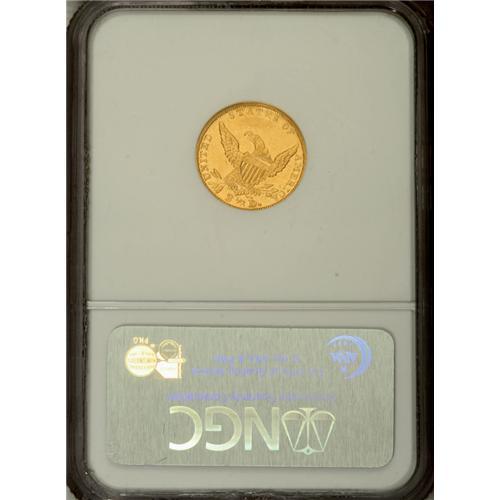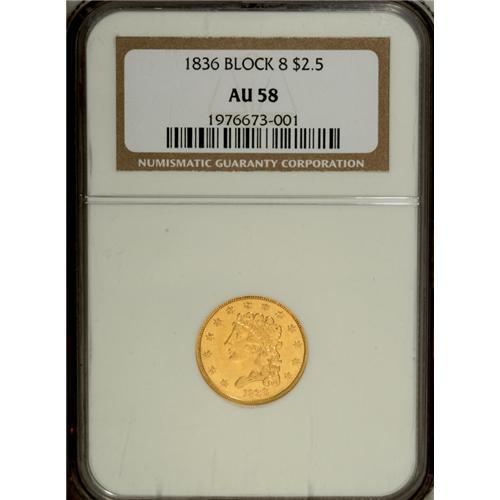 <B>1836 $2 1/2 Block 8 AU58 NGC.</B></I> McCloskey-B, Head of 1834, Breen-6142, R.3. The 3 in the date leans left on McCloskey-B, while the 2 in the fraction nearly touches the bar. Yellow-gold surfaces retain luster in the recessed areas, and are only lightly abraded. Nice detail is apparent on the design features.<BR><BR><b>Shipping:</b> Coin/Currency (<a target="_blank" href="http://www.heritageauctions.com/common/shipping.php">view shipping information</a>)