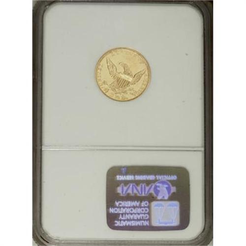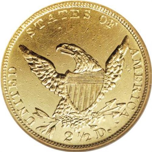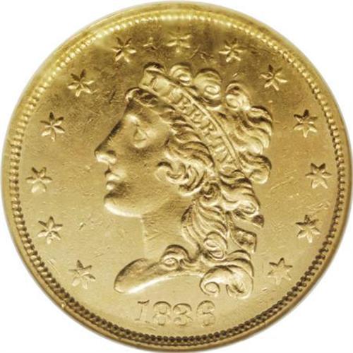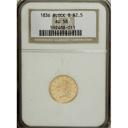 <B>1836 $2 1/2 Block 8 AU58 NGC.</B></I> Head of 1834, Breen-6142, McCloskey-B, R.3. This Classic quarter eagle has well struck centers, and the borders are also sharp save for minor softness near STATES and the date. Luster fills the eagle and Liberty's hair. The light gold surfaces show only moderate marks.<BR><BR><B>Coin Engraver:</B> William Kneass<BR><BR><b>Shipping:</b> Coins & Currency (<a target="_blank" href="http://www.heritageauctions.com/common/shipping.php">view shipping information</a>)