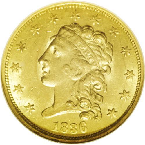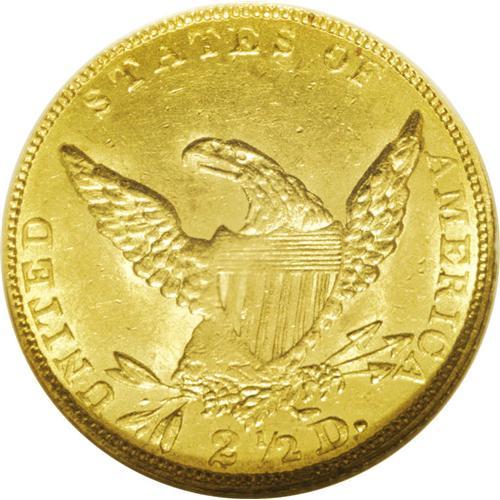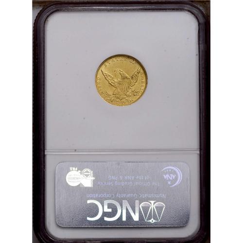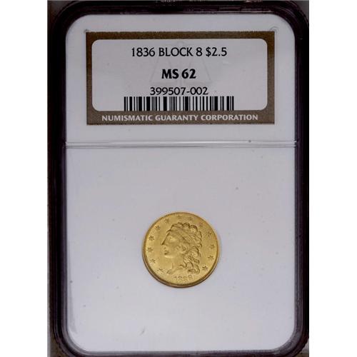 <B>1836<$2 1/2> Block 8 MS62 NGC.</B></I> Head of 1837. Breen-6144, McCloskey-C, R.2. The flat first hair curl above Liberty's headband confirms the Head of 1837. Yellow-gold surfaces are imbued with subtle greenish tints. The strike is typical for the variety, showing weakness in the hair at Liberty's forehead and ear, on the shield, and on the eagle's left (facing) leg. The luster is somewhat subdued, and light abrasions are noted over each side. Census: 21 in 62, 13 finer (6/06).