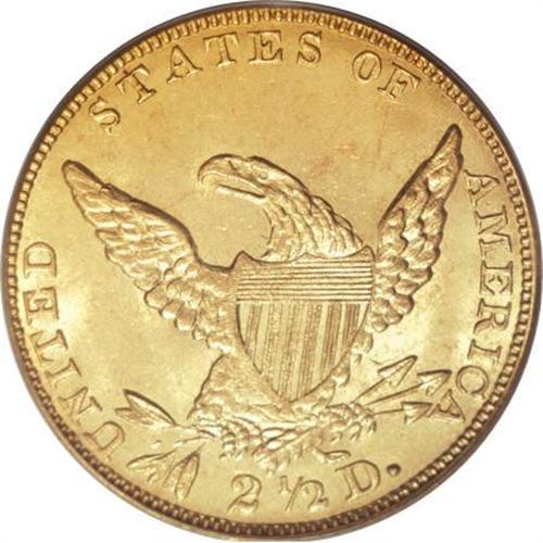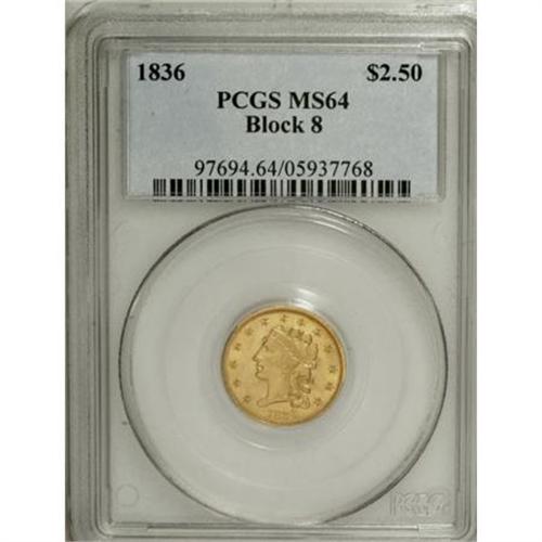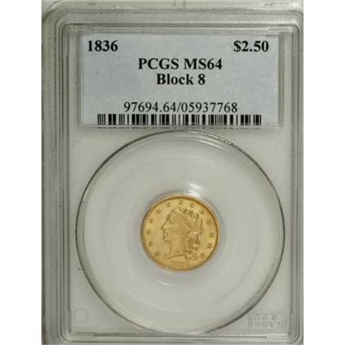 <B>1836 $2 1/2 Block 8 MS64 PCGS.</B></I> Breen-6144. Head of 1837, Reverse with Olive Bud. This variety is relatively common, with a quite a number of Mint State examples known, including Choice and Gem specimens. The Head of 1837 is identified by the shape of the hair over the top left corner of the headband, sweeping back into the top curl that is below star 7. This head type is known with two different reverse dies, either with a small olive bud in the branch, or without. The type without a berry or bud in the branch is extremely rare, with only one Mint State piece known. This is a lovely Choice Mint State specimen with brilliant greenish-yellow gold that is enhanced by a trace of pale orange toning. The central obverse and reverse details are a little weak, but overall it is sharper than most. The surfaces are quite exceptional, with few marks of any consequence.<BR><BR><b>Shipping:</b> Coins & Currency (<a target="_blank" href="http://www.heritageauctions.com/common/shipping.php">view shipping information</a>)