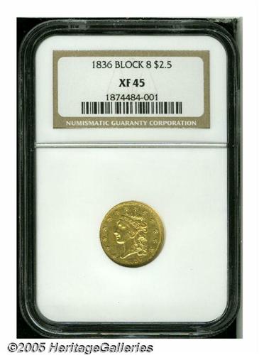 <B>1836<$2 1/2> Block 8 XF45 NGC.</B></I> McCloskey-C, Head of 1837, Breen-6144, R.2. Luster illuminates portions of this lightly circulated example. The strike is bold on the stars, and somewhat soft in the centers. A faint pinscratch from the T in UNITED passes through the eagle's head and right (facing) wing.