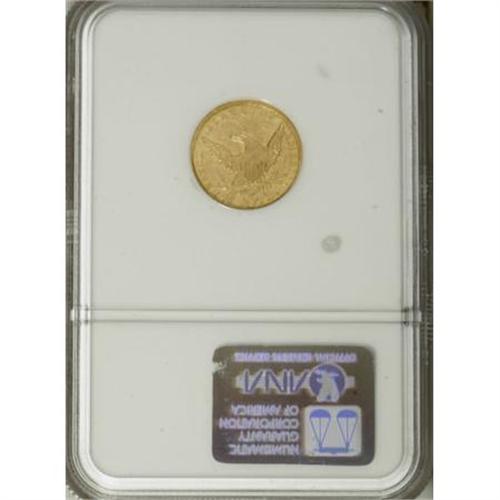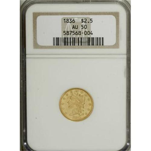 <B>1836 $2 1/2 Script 8 AU50 NGC.</B></I> Head of 1835, Breen-6143, McCloskey-D, R.2. A green-gold example with the familiar radial die crack through star 6 that disappears in Liberty's headband, then re-emerges between the ribbon ends. The centers are typically struck, but the stars are sharply defined.<BR><BR><B>Coin Engraver:</B> William Kneass<BR><BR><b>Shipping:</b> Coins & Currency (<a target="_blank" href="http://www.heritageauctions.com/common/shipping.php">view shipping information</a>\)